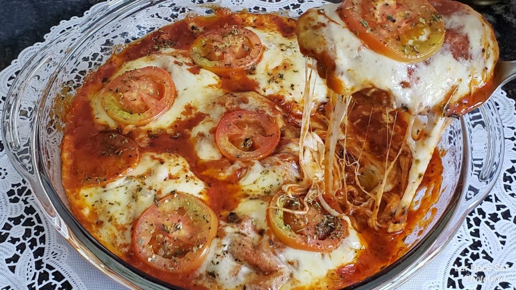 - Em uma travessa de vidro ou forma de alumínio, espalhe um pouco de molho de tomate no fundo.
