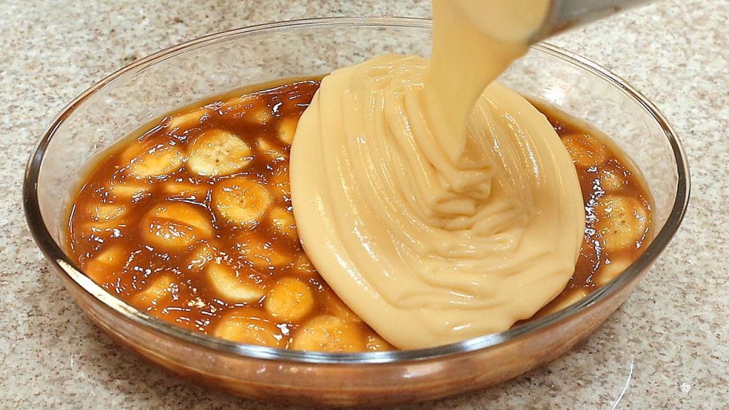 - Despeje o creme sobre as bananas na travessa e espalhe bem.